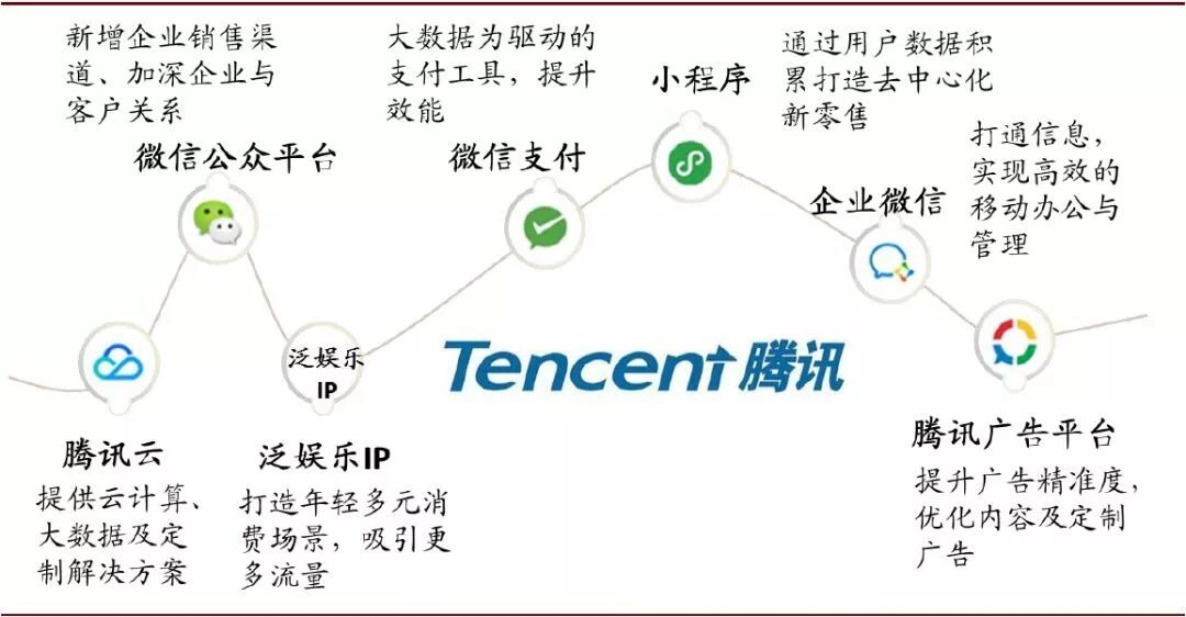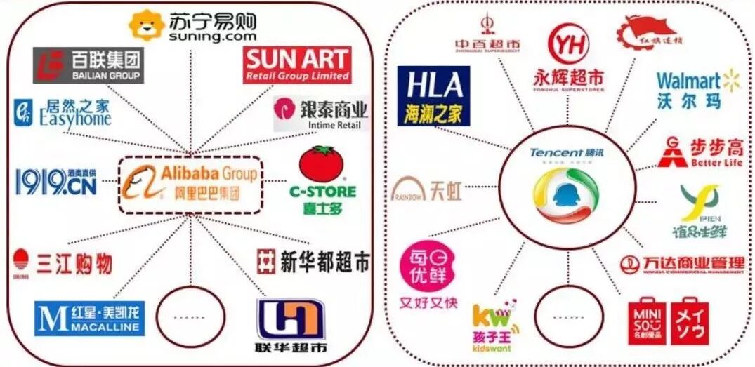 围绕阿里和腾讯的新零售布局,线下实体零售商已悄然形成两大阵营。一面是以阿里为主导的中心化体系,特点是以阿里的对外赋能改造为主导,阵营中包含苏宁易购、高鑫零售、银泰商业等实体零售商;另一面是以腾讯为主导的去中心化体系,特点是以零售商自身为新零售改造的推进者,腾讯与零售商之间形成以赋能为纽带的连接体系,阵营中包含万达、名创优品、永辉超市、沃尔玛等实体零售商。
